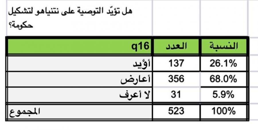 وأوضحت هذه الاستطلاعات أن ما يقارب ال 70% بالمعدل من المجتمع العربي تعارض دعم نتنياهو من قبل اي قائمة عربية، وعبّر 64% من المستطلعين عن رأيهم بأن نتنياهو يتحمل مسؤولية تفاقم العنف والجريمة ولا يمكن حل المشكلة ما دام هو في السلطة.
