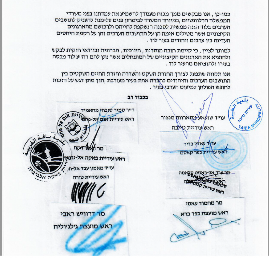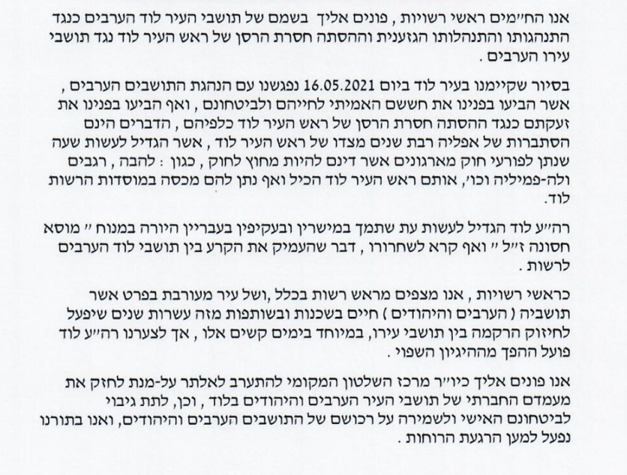 وقرر الرؤوساء ببعث رسالة شديدة اللهجة لرئيس مجلس السلطات المحلية حاييم بايس واعتراضهم واستنكارهم لما يقوم به رئيس بلدية اللد تجاه المواطنين العرب وتحريضه المستمر على العرب هناك وتفوهاته العنصرية تجاه العرب بشكل عام ودعمه المطلق للمستوطنين .
