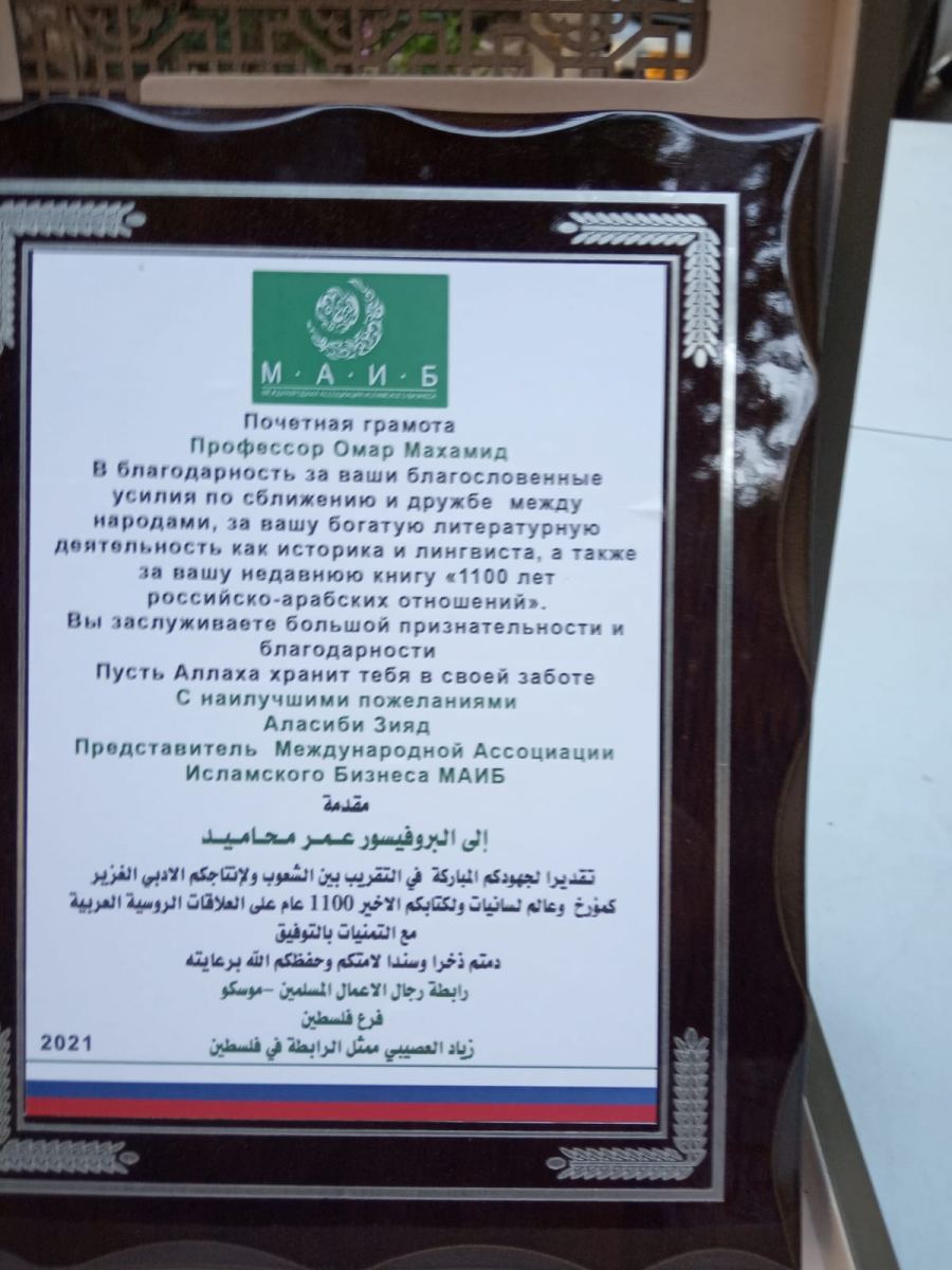 قام ممثل رابطة رجال الأعمال المسلمين يوم أمس 27-6-2021 في قاعة متحف تراث اللجون بتسليم بروفيسور عمر محاميد درع رابطة رجال الاعمال المسلمين "مياب" وذلك تقديرا لجهو دكم المباركة في التقىير بين الشعوب ولانتاجكم الادبي الغزير كمؤرخ وعالم لسانيات ولكتابكم الأخير 1100عام على العلاقات الروسية العربية .