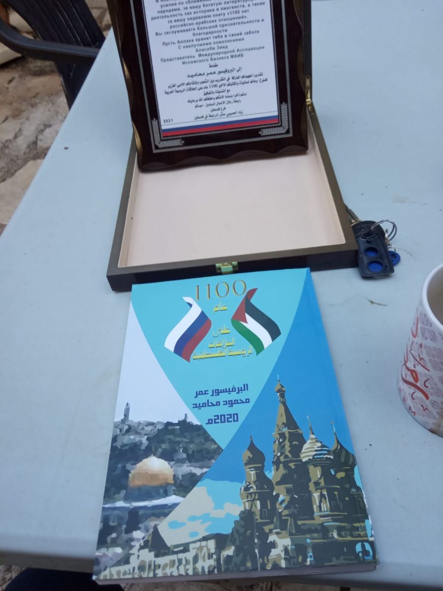 كنوز نت - ام الفحم ٢٧/٦/٢٠٢١ ممثل الرابطة الدولية لرجال الاعمال المسلمين الروس زياد العصيبي يكرم بروفيسور عمر محاميد بمناسبة اصداره كتاب ١١٠٠ عام للعلاقات العربية الروسية ويقلده وشاح الكرامة.