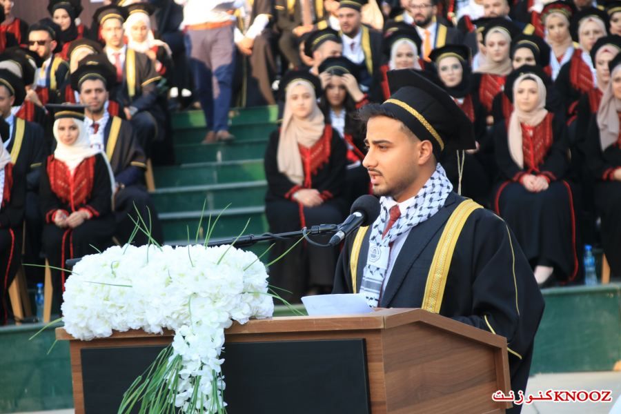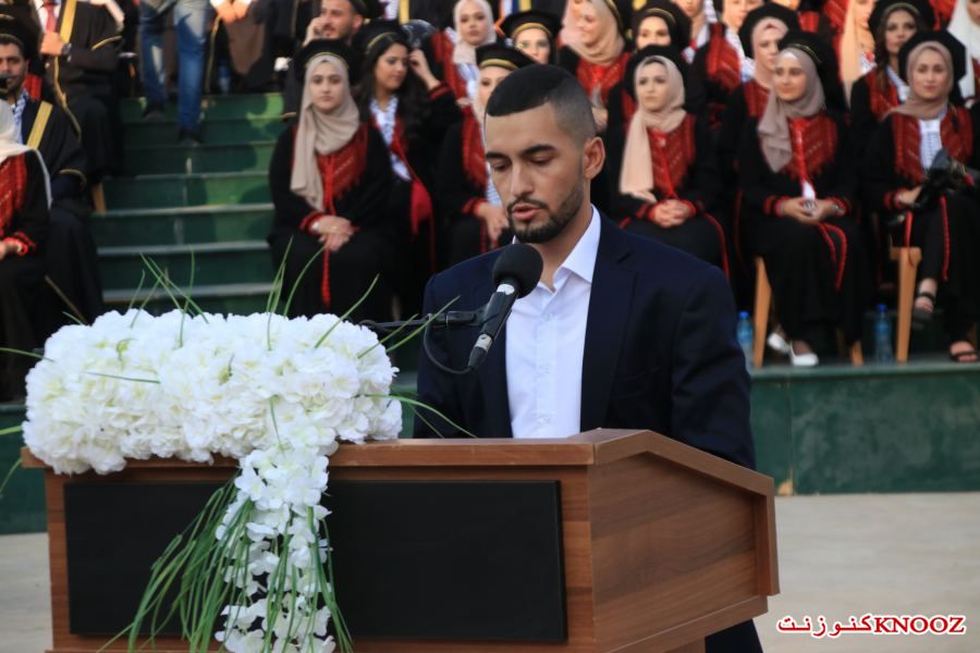 أما الطالب مؤنس زيد فقدم كلمة الخريجين عن كلية طب الأسنان والتي أشاد بها بالدور الكبير والتنموي والأكاديمي النوعي لجامعة القدس من أجل رفد المجتمع بخريجين مؤهلين على كافة المستويات العلمية، قائلاً: "لقد كانَ مدداً جميلاً أن تكون جامعتنا على مشارف القدس، وأن يكون طلبتها حماة ثغورها وحراس أهدابها".