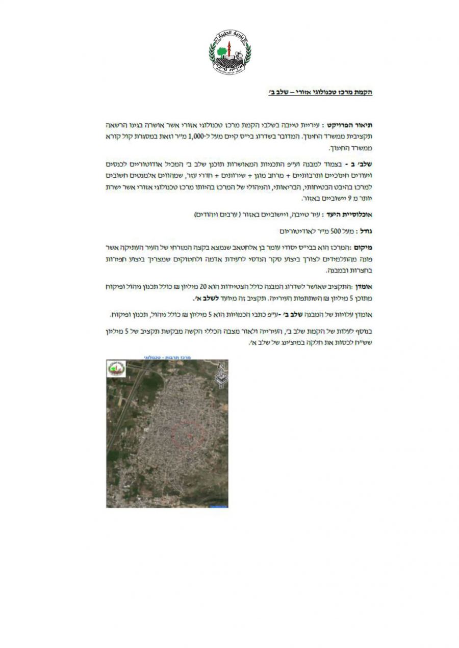 • المساهمة باستكمال الميزانيات اللازمة لاقامة وبناء المركز التكنولوجي والتي تُقدر بنحو 5 ملايين شيقل.