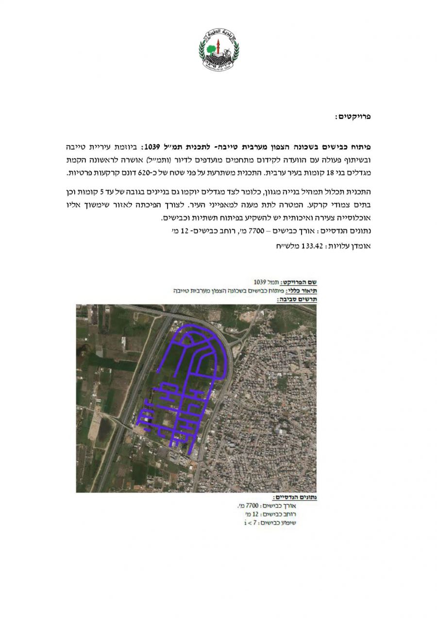 • ميزانيات لفتح وشق الشوارع في الخارطة المُفصّلة الواقعة شرقي شارع 6 وغربي شارع 444 الواقعة شمالا لمدرسة عتيد المجد الشاملة على اسم المرحوم شريف دعسان (تمال 1039) والتي تقدر بنحو 133 مليون شيقل.