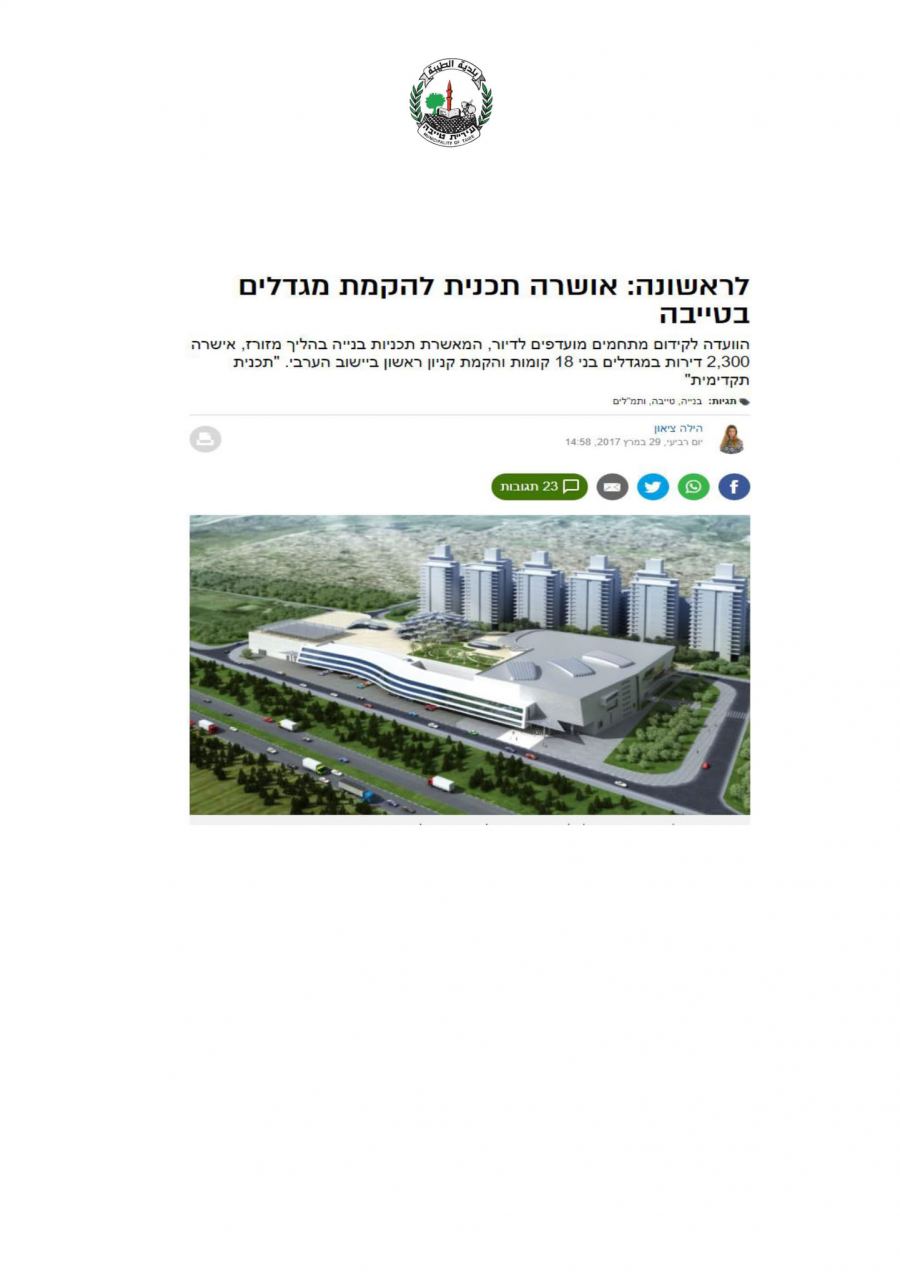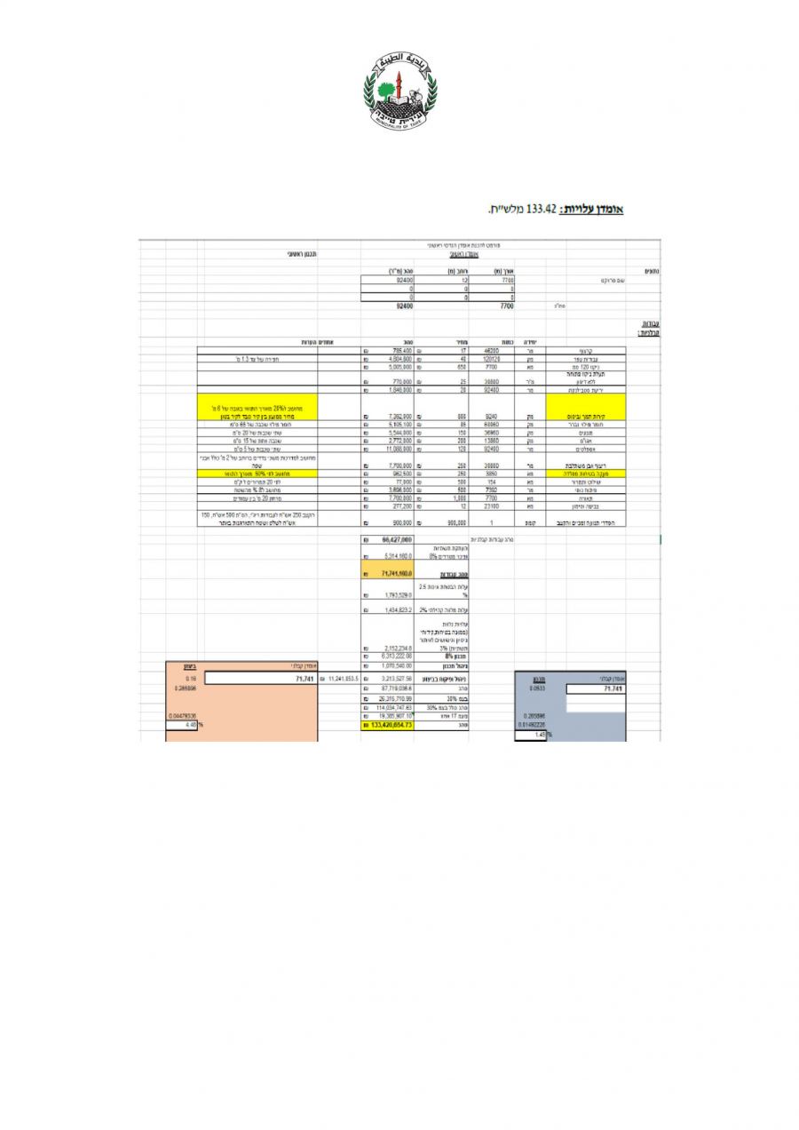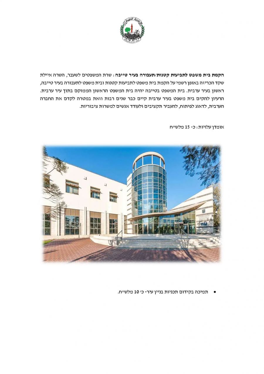 • تخصيص ميزانية لاقامة محكمة الصلح في الطيبة وتقدر بنحو 15 مليون شيقل.