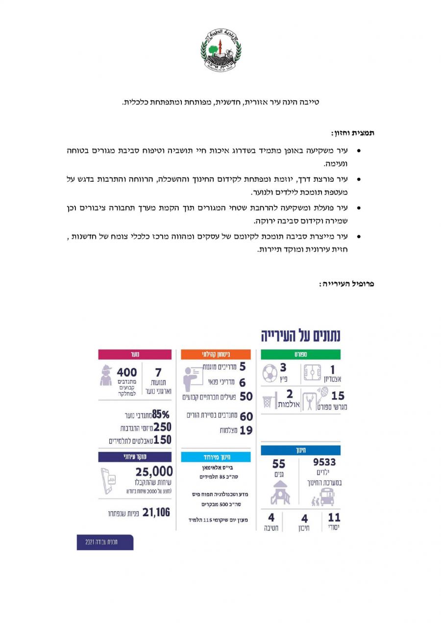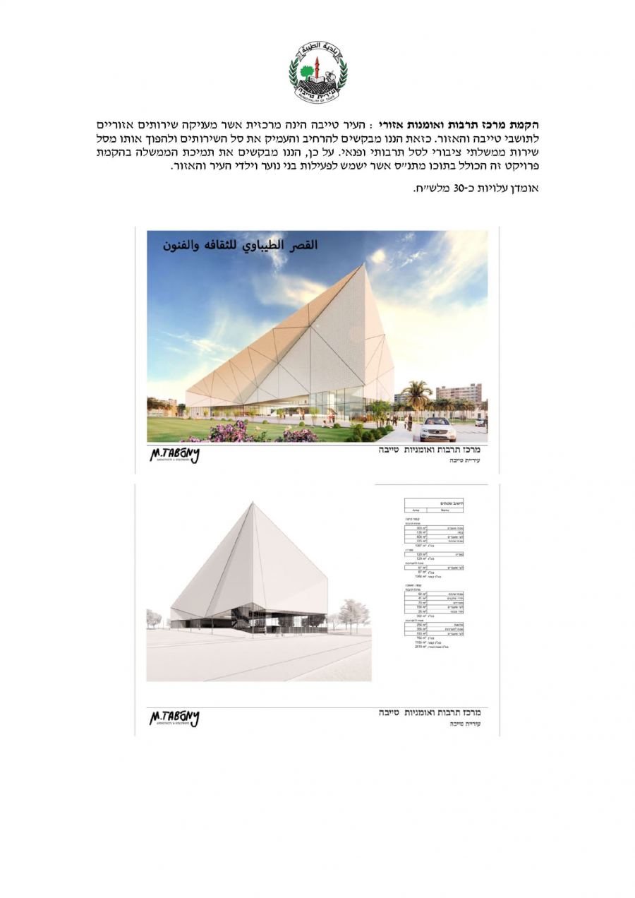 • اقامة وبناء القصر الثقافي الطيباوي بميزانية خاصة على نفقة البلدية بشكل كامل بميزانية تقدر نحو 30 مليون شيقل.