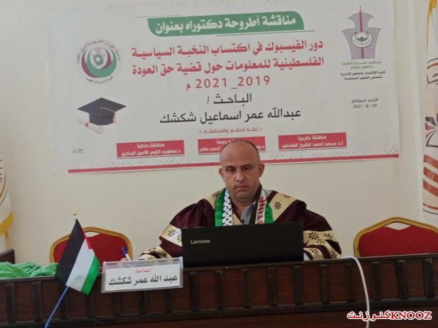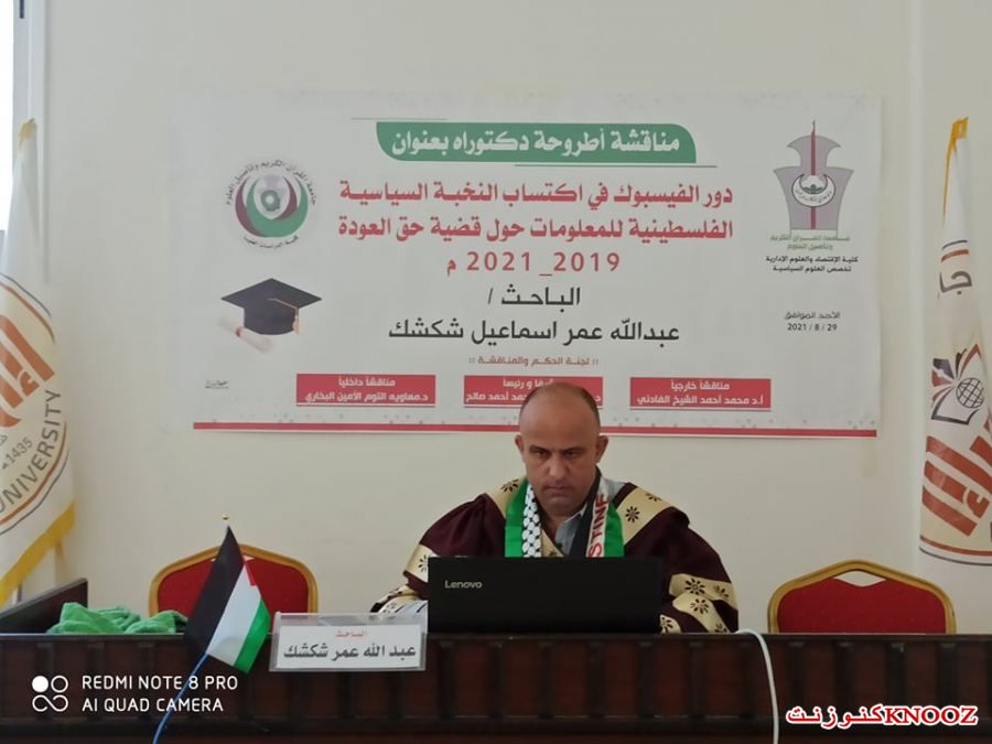 كنوز نت - منحت جامعة القران الكريم وتأصيل العلوم الباحث الفلسطيني عبدالله عمر الدكتوراة في العلاقات الدولية بتقدير ممتاز مع مرتبة الشرف بالرسالة تحت عنوان دور الفيسبوك في اكتساب معلومات للنخبة السياسية الفلسطينية حول قضية حق العودة 2019-2021م.
