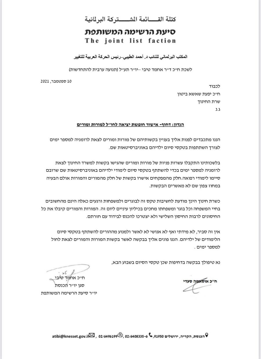 أعلنت وزيرة التربية والتعليم يفعات شاشا بيطن عن موافقتها للسماح للمعلمين والمعلمات، أهالي الطلاب الخريجين من كليات الطب في جامعات رومانيا، للمشاركة في حفل تخرج أبنائهم في الأيام القريبة، وذلك في أعقاب توجه النائبان عن العربية للتغيير في القائمة المشتركة د. أحمد الطيبي وأسامة السعدي.