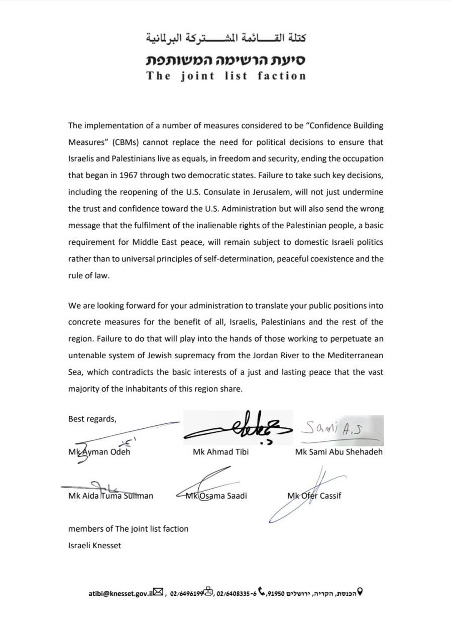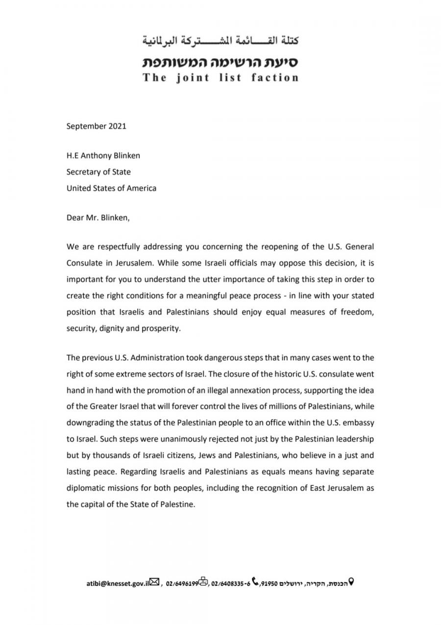 نواب المشتركة يبرقون برسالة لوزير الخارجية الأمريكي بلينكين، مطالبين إياه بإعادة فتح القنصلية الأمريكية في القدس الشرقية.