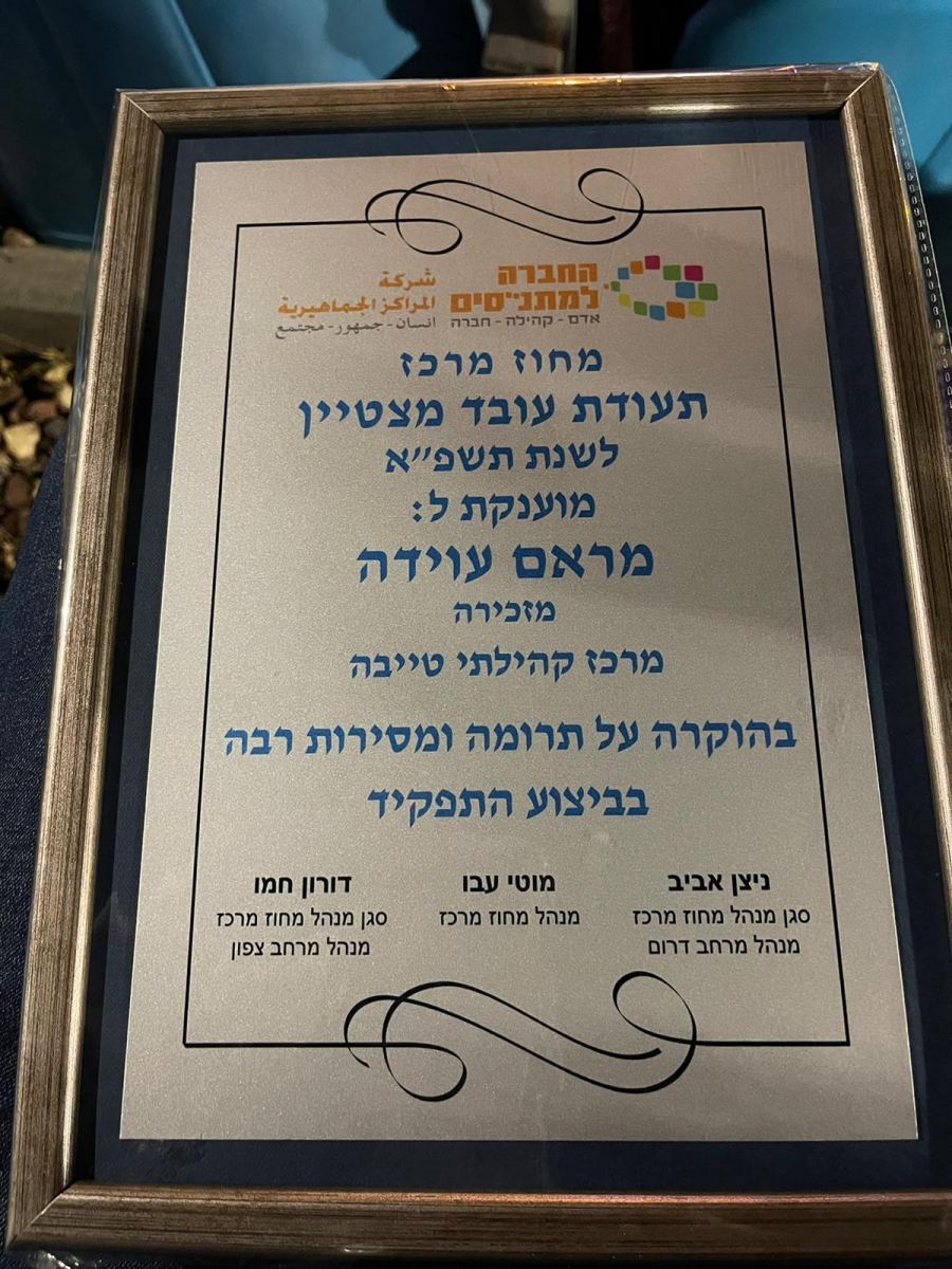 السيدة مرام عويضة من الطيبة تفوز بجائزة العامل المتفوق لعام 2021 من قبل شركة المراكز الجماهيرية