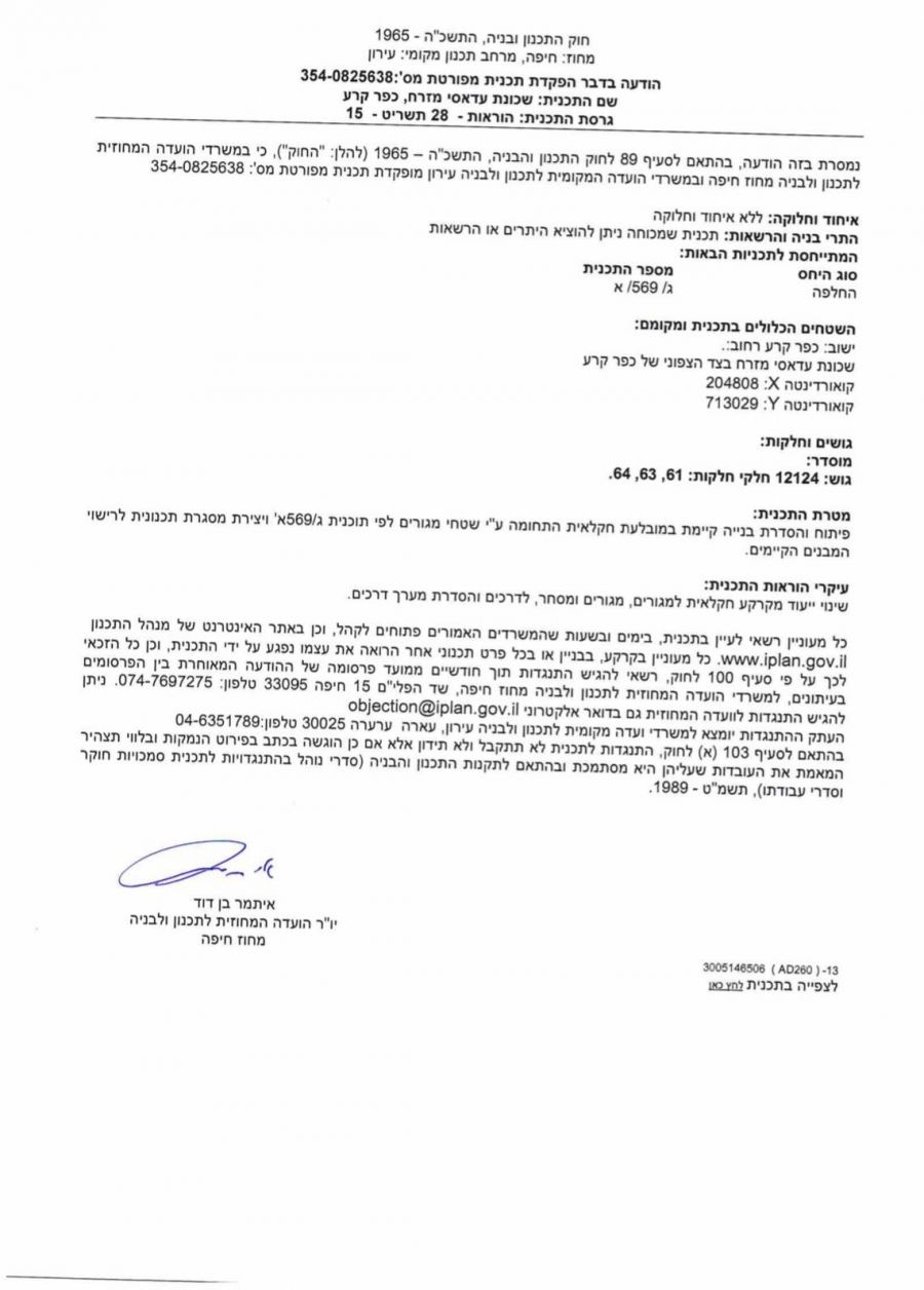 بيان صادر عن مجلس محلي كفرقرع : صادقت اللجنة اللوائية للتخطيط والبناء-حيفا على إيداع الخارطة التفصيلية لحي العداسي شمال كفرقرع. وتأتي هذه الخطوة بعد المصادقة على احياء أخرى , واستكمالا للمخططات السابقة بإعداد خرائط تفصيلية في أحياء البلدة بهدف مساعدة المواطنين في استصدار رخص بناء ورخص لربط البيوت بالكهرباء في المناطق التي أعدّت فيها خرائط مفصّلة. إدارة المجلس المحلي ناشدة مواطني حي العداسي بالاطلاع على الخارطة التي تم ايداعها من اجل تقديم اعتراضاتهم وملاحظاتهم.