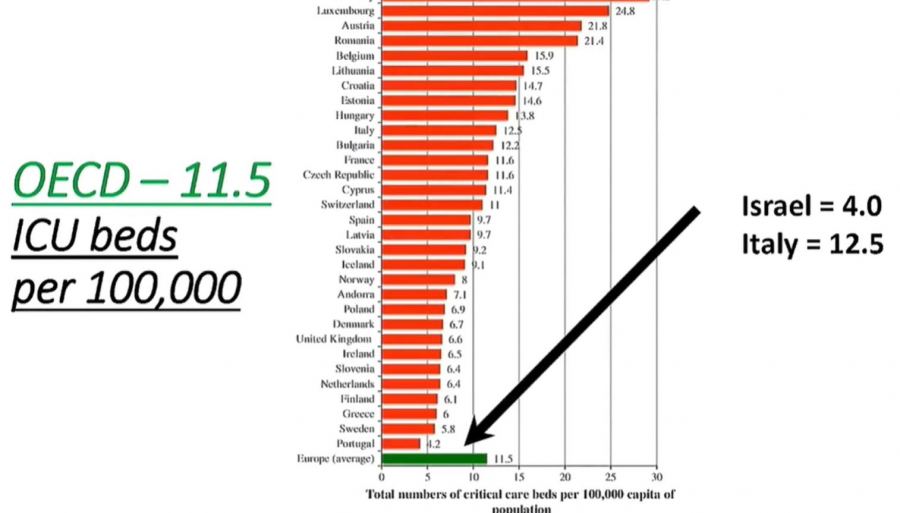 من المعطيات يتبيّن بأنّ مُعدّل عدد الأسرّة للعلاج المكثف في المستشفيات في دول ال OECD هو 11.5 سرير لكل 100 ألف نسمة، بينما اسرائيل تحتل المركز الأخير مقارنةً بتلك الدول مع 4 أسرّة لكل 100 ألف نسمة.