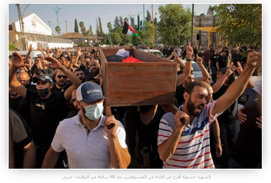 ولفتت إلى تعامل المحاكم الإسرائيلية مع استشهاد فلسطيني باللد، بصورة مختلفة عن يهودي قتل في الفترة ذاتها، وقالت إن كافة قتلة الشهيد موسى حسونة، كانوا من اليهود، وأفرج عنهم بكفالة بعد أقل من 48 ساعة على قتله، رغم وجود مقطع مصور لحظة قتله، والذريعة كانت الدفاع عن النفس.