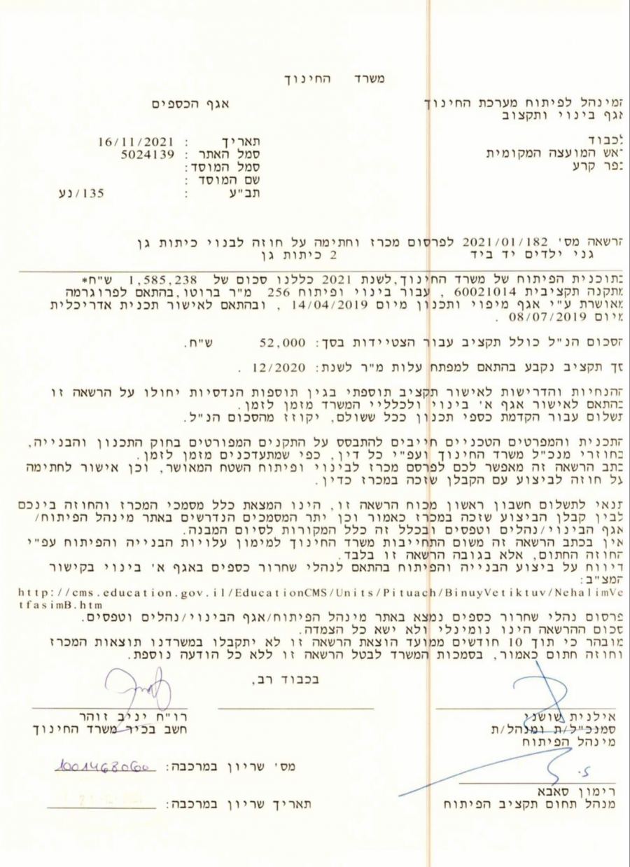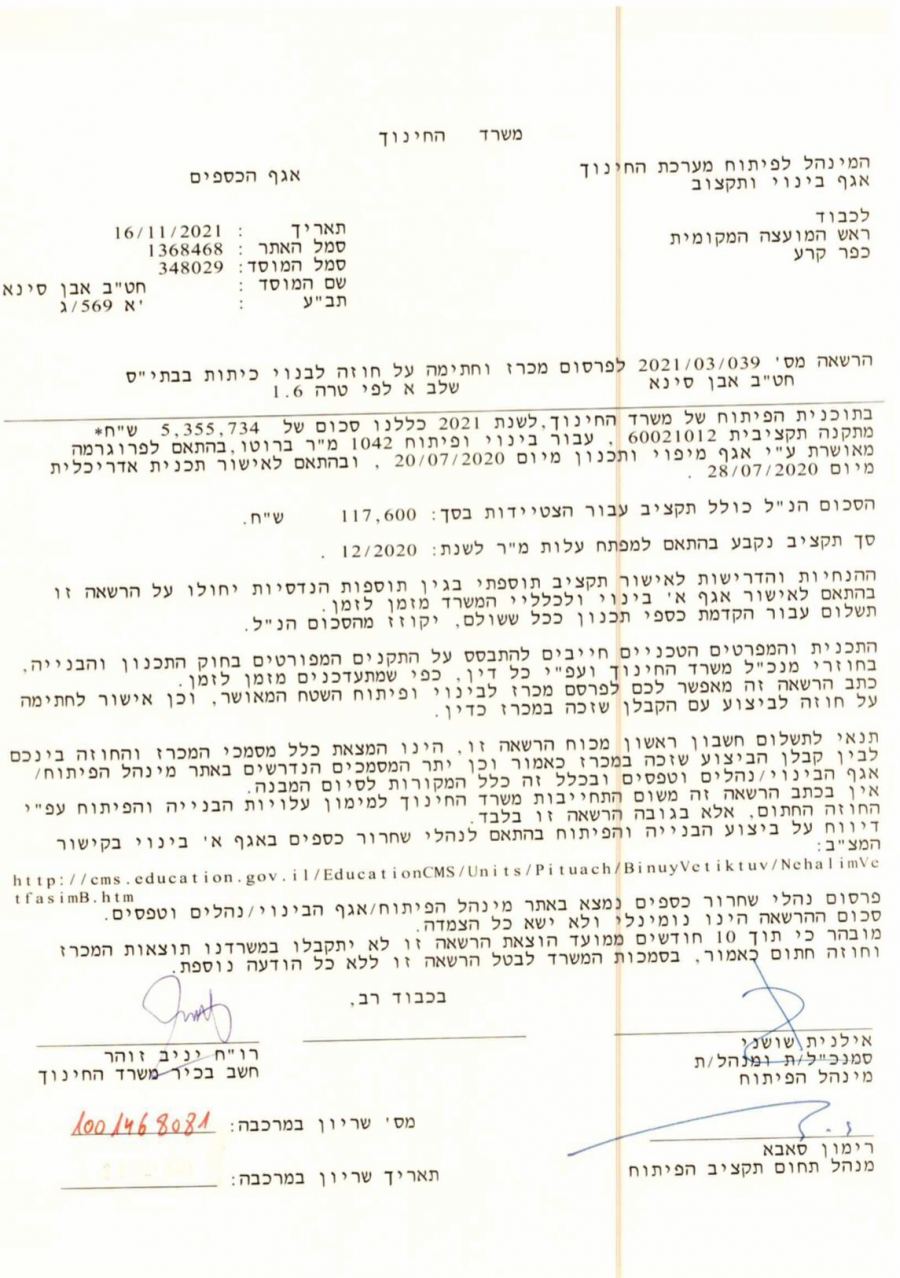 وفي نفس السياق فقد صادقت وزارة المعارف للمجلس المحلي على ميزانية 5,355 مليون شيقل لبناء جناح جديد بمدرسة ابن سينا الإعدادية، ومبلغ اضافي اخر 1,585 مليون شيقل لبناء رياض اطفال.