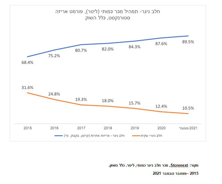 وفقًا لمعطيات ستيرنكاست ، انخفض استهلاك الحليب في الأكياس في السنوات السبع الماضية بنسبة 21٪ وبالتالي زاد استهلاك الكراتين والزجاجات والأباريق ، والتي تشكل حاليًا حوالي 90٪ من إجمالي سوق الحليب. على خلفية هذا الطلب ، أنشأت تنوفا خط إنتاج خامس للكرتون في عام 2019 ، والخط الجديد الذي سيبدأ العمل في الربع الثاني من هذا العام سيكون الخط السادس للكرتون في المحلبة في البلاد.