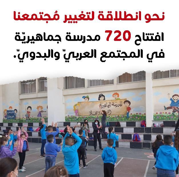 مايقارب الـ70 مليون شاقل على جميع المدارس العربيّة والبدويّة وعددها ٧٢٠ مدرسة تتبع لأكثر من ٨١ سلطة محليّة تشمل المدن المختلطة وذلك بهدف تحويل هذه المدارس بكل أشكالها ( مدارس رسمية ، أهلية ، كنسية ، خاصّة ، صناعيّة، والخ) مدارس جماهيريّة والتي ستفتح أبوابها للنّشاطات والفعاليّات بساعات ما بعد الظهر.