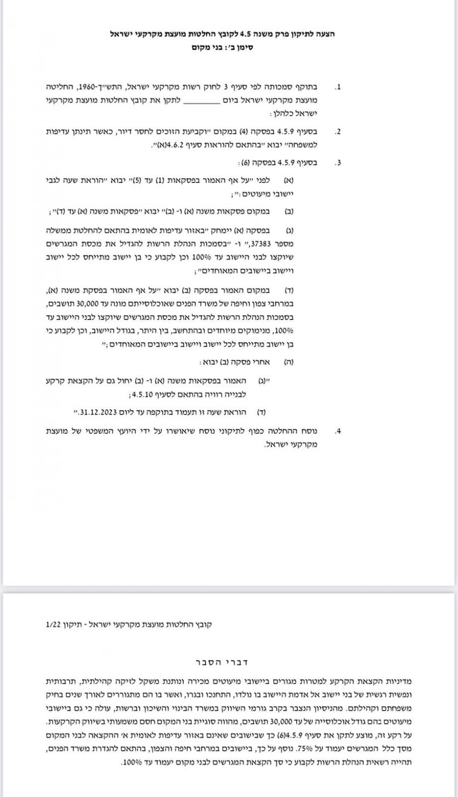 وبحسب قرار المنهال الأخير، فقد تم رفع نسبة استحقاق أصحاب البلد (זכאות לבני מקום) في مناقصات توزيع القسائم والشقق في كل البلدات التي عدد سكانها حتى 30 ألف نسمة إلى 75% بدلًا من 25-40% كما كان في السابق، وبذلك تم ضم كل بلدات المثلث الجنوبي لهذا التعديل الجديد، إضافة لجميع البلدات التي لم تكن ضمن قائمة البلدات الحاصلة على تفضيل وزاري.