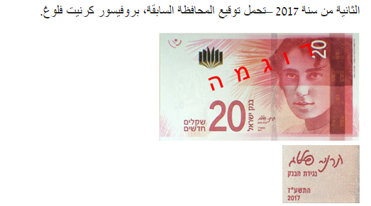 يعلن بنك إسرائيل للجمهور أنّه في الأيّام القريبة، سيتم للمرّة الأولى نشر ورقة نقديّة من فئة 20 شيكل لاستخدام الجمهور والتي تحمل توقيع المحافظ الحالي، بروفيسور أمير يارون. وذلك وفقًا لتعليمات المادّة 42(أ) من قانون بنك إسرائيل 2010، والتي تنص على أنّ الأوراق النقديّة التي يتم إصدارها للجمهور تحمل توقيع محافظ بنك إسرائيل.