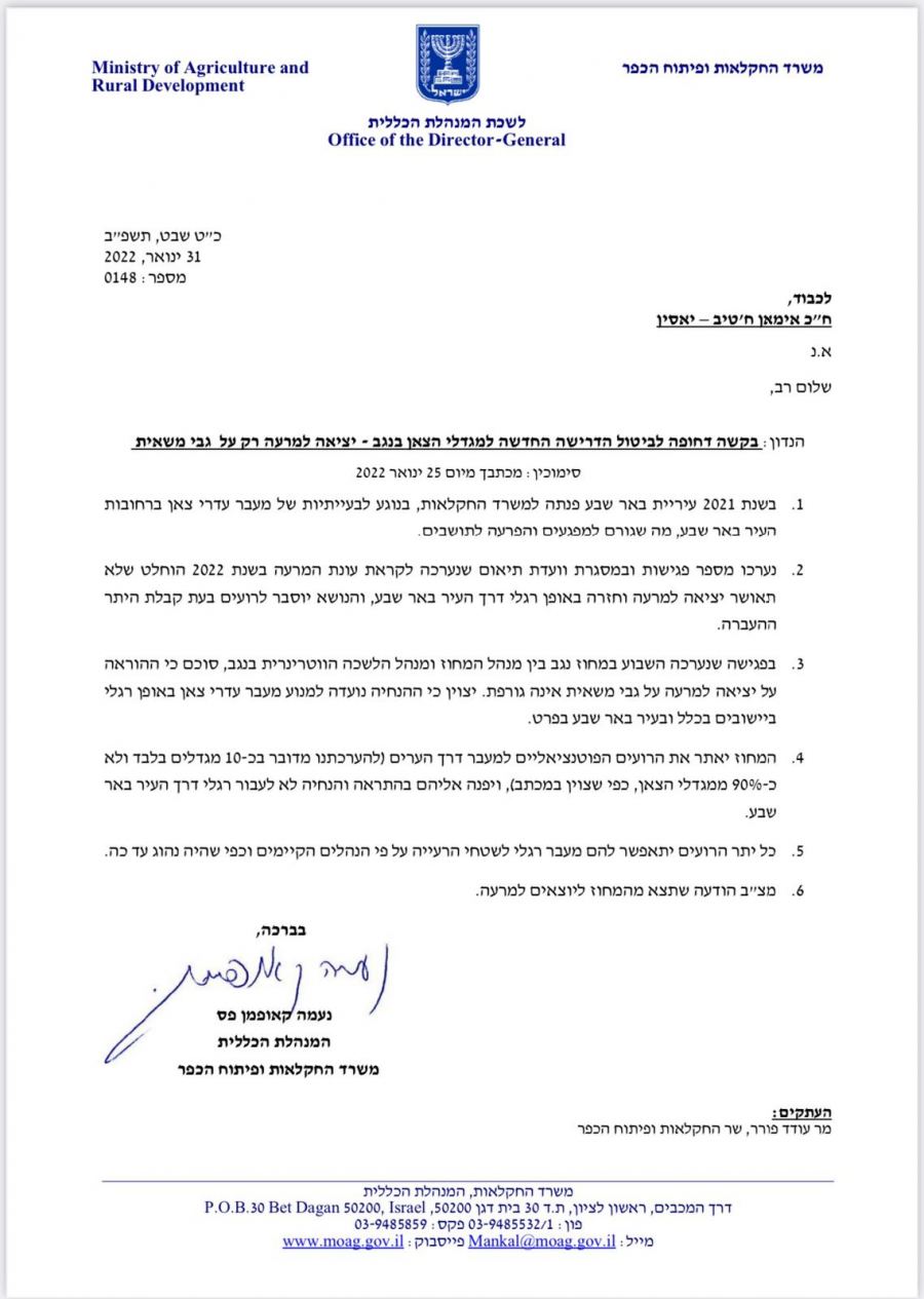 استجابت وزارة الزراعة لطلب النائبة عن القائمة العربية الموحدة إيمان خطيب ياسين وأعلنت عن التراجع عن أمر منع مربي المواشي نقل مواشيهم مشيًا على الأقدام عبر الشوارع والطرقات، وألغت أمر إجبارهم على نقلها عبر الشاحنات.