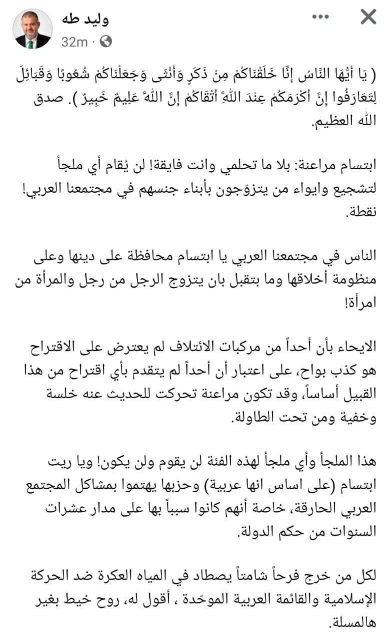كنوز نت - قال النائب وليد طه في منشور له على صفحة الفيس بوك : ابتسام مراعنة: بلا ما تحلمي وانت فايقة! لن يُقام أي ملجأ لتشجيع وايواء من يتزوّجون بأبناء جنسهم في مجتمعنا العربي! نقطة.