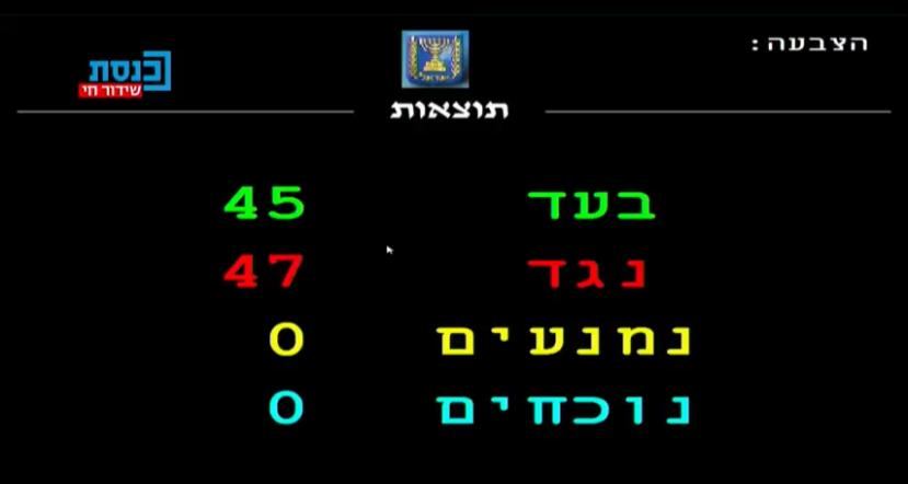 وقد سقط القانون بفارق صوتين فقط حيث صوّت مع القانون 45 نائبًا بينما عارضه 47 نائبًا، والجدير ذكره أنّ النوّاب العرب في الحكومة صوّتوا جميعهم ضد اقتراح القانون.