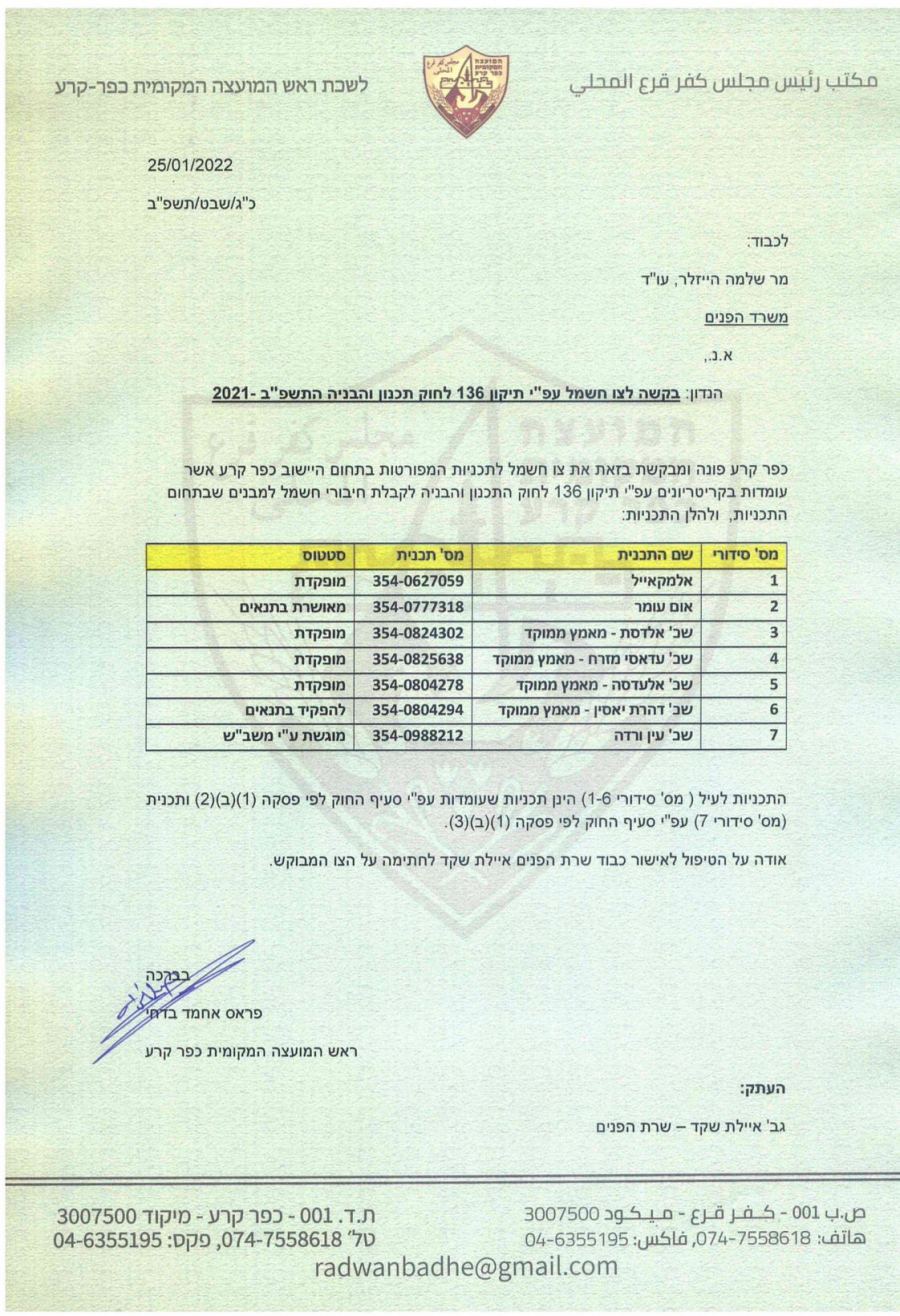 كنوز نت - اوصت لجنة التخطيط والبناء لواء حيفا في ختام جلستها اليوم والتي شارك فيها المحامي فراس بدحي رئيس مجلس محلي كفرقرع ، لوزيرة الداخلية بمنح تراخيص لربط البيوت بشبكة الكهرباء في خمسة احياء في بلدة كفرقرع وهي :