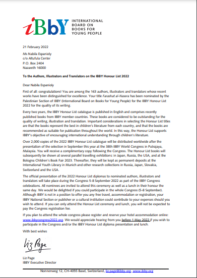 كنوز نت - أعلم المجلس العالمي لكتب الأطفال (ايبي) عن ادراجه قصة "فراشة الناصرة" من تأليف نبيلة اسبانيولي ورسومات عبد الله قواريق وإصدار مركز الطفولة (مؤسسة حضانات الناصرة) على قائمة الشرف بعد توصية فرع فلسطين على نصها بكونه نص مميّز.