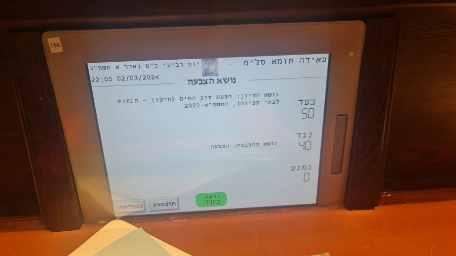 كنوز نت - طرحت النائبة عايدة توما-سليمان باسم القائمة المشتركة مقترح قانون يهدف إلى تخفيض أسعار المياه في بيوت العبادة أسوةً بالمستشفيات وبرك التطهر الدينية لدى اليهود (الميكفآوت) الذين يحصلون على التخفيض حسب قانون المياه. ويذكر أن القانون قد مر بالقراءة التمهيدية حيث دعمه ٥٠ عضوًا وعارضه ٤٠.