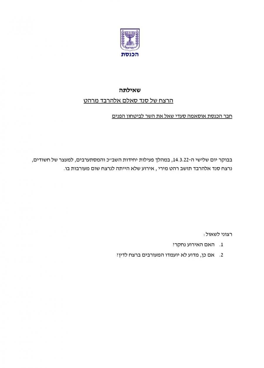 كنوز نت - قدم النائب أسامة السعدي (العربية للتغيير-القائمة المشتركة) استجوابًا لوزير الأمن الداخلي عومر بار-ليف حول قضية استشهاد الشاب سند سالم الهربد من مدينة رهط صباح اليوم برصاص المستعربين وأفراد الشاباك.