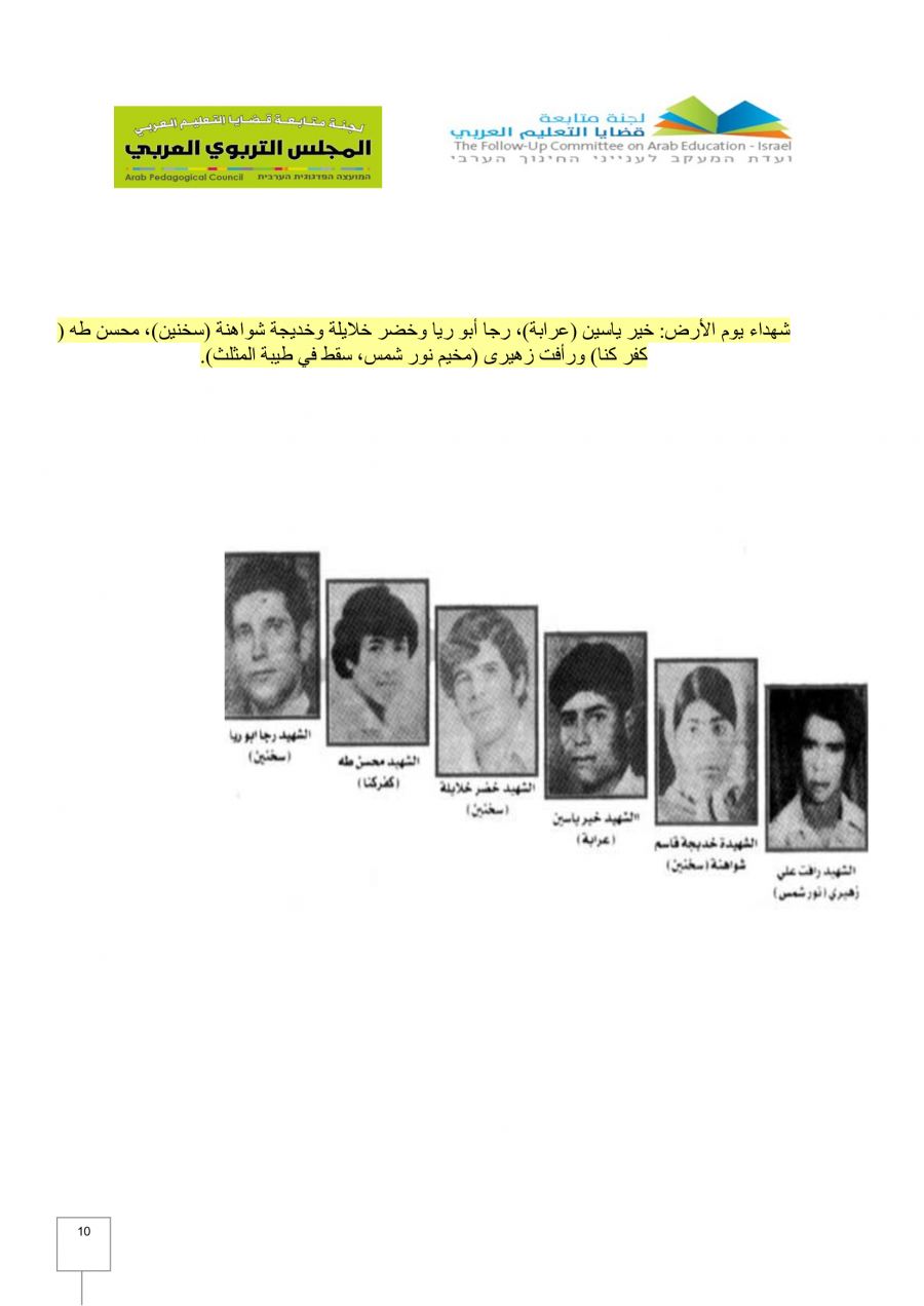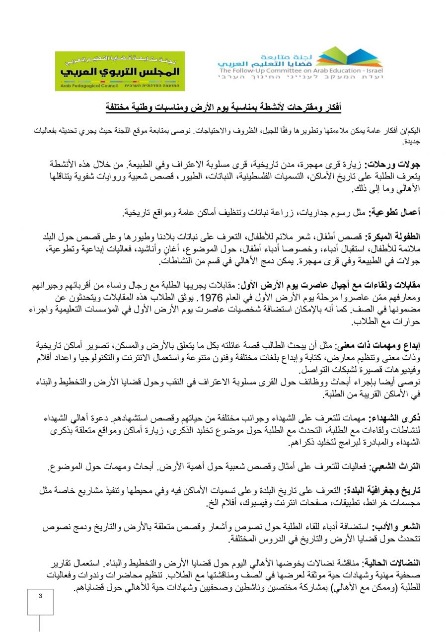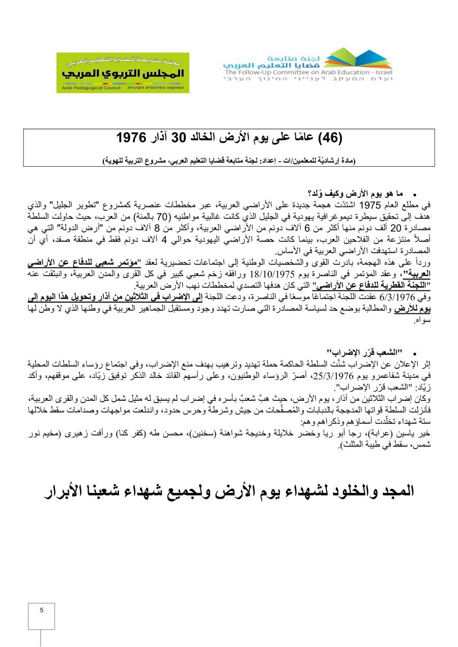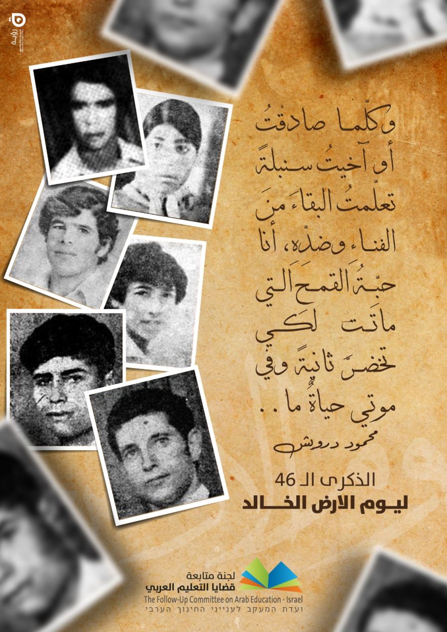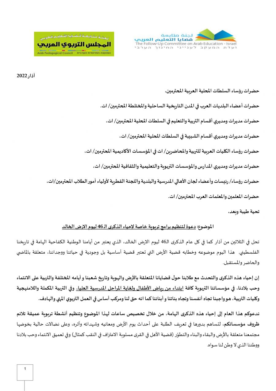 - رسالة لجنة متابعة قضايا التعليم العربي والمجلس التربوي في الذكرى الـ 46 ليوم الأرض الخالد