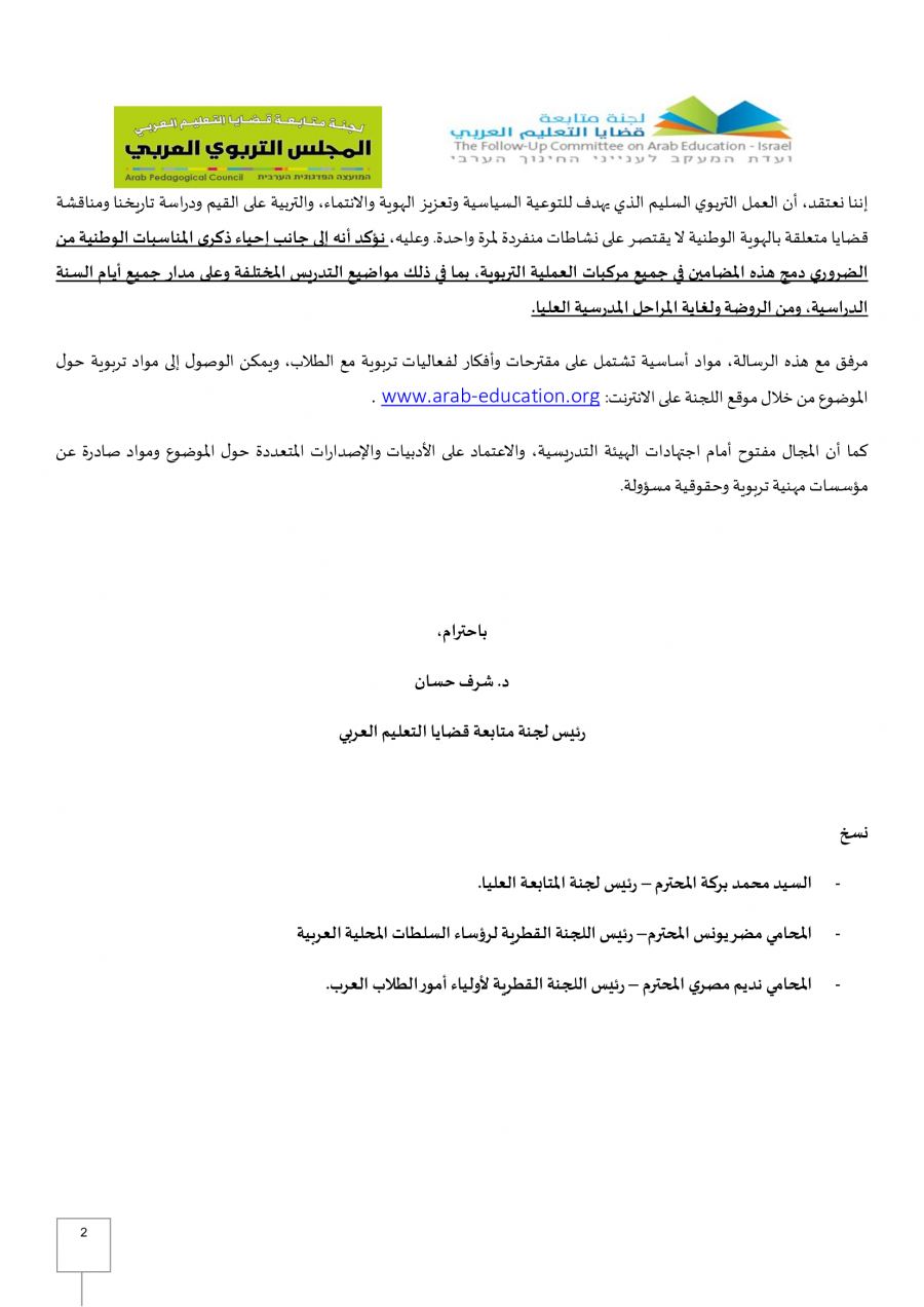 وأكدت اللجنة أن "العمل التربوي السليم الذي يهدف للتوعية السياسية وتعزيز الهوية والانتماء، والتربية على القيم ودراسة تاريخنا ومناقشة قضايا متعلقة بالهوية الوطنية، لا يقتصر على نشاطات منفردة لمرة واحدة، وعليه نؤكد أنه إلى جانب إحياء ذكرى المناسبات الوطنية من الضروري دمج هذه المضامين في جميع مركبات العملية التربوية، بما في ذلك مواضيع التدريس المختلفة وعلى مدار جميع أيام السنة الدراسية، ومن الروضة ولغاية المراحل المدرسية العليا".