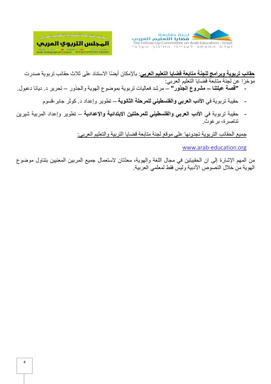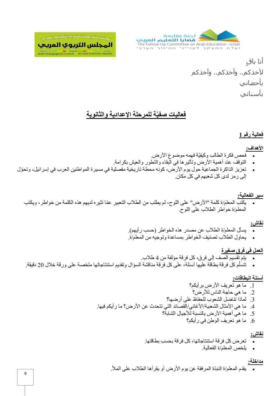 هذا وكانت لجنة متابعة قضايا التعليم العربي والمجلس التربوي العربي المنبثق عنها قد نظما ندوة رقمية يوم الخميس الماضي تحت عنوان "تعزيز الارتباط بالأرض والهويّة في عمر الطفولة المبكرة والمرحلة الابتدائية"، بمناسبة الذكرى الـ 46 ليوم الارض الخالد.
