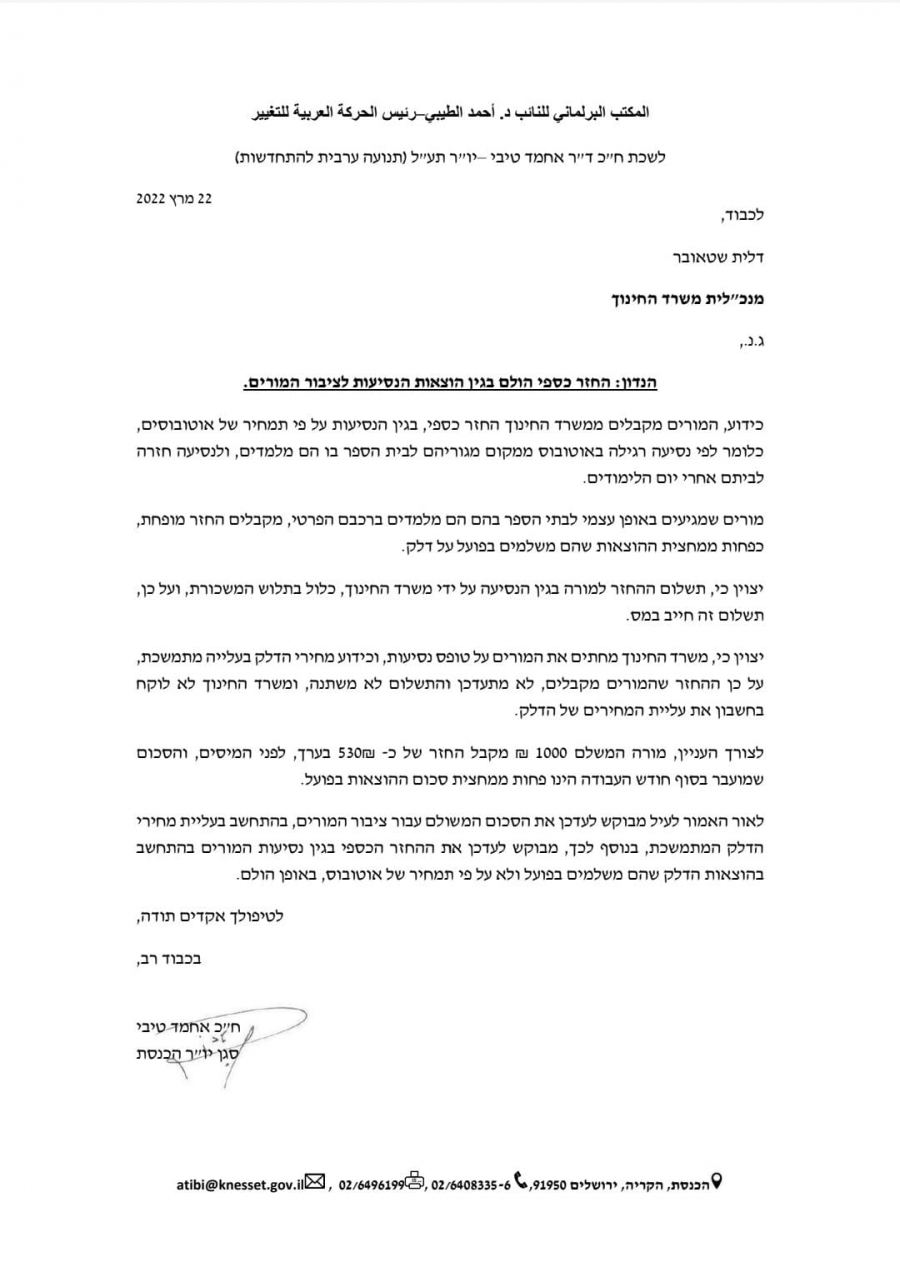كنوز نت - أرسل النائب د. أحمد الطيبي (العربية للتغيير- القائمة المشتركة) رسالة الى مديرة عام وزارة التربية والتعليم داليت شطاوبر مطالبًا اياها برفع مبلغ استرداد تكاليف السفريات للمعلمين والمعلمات.