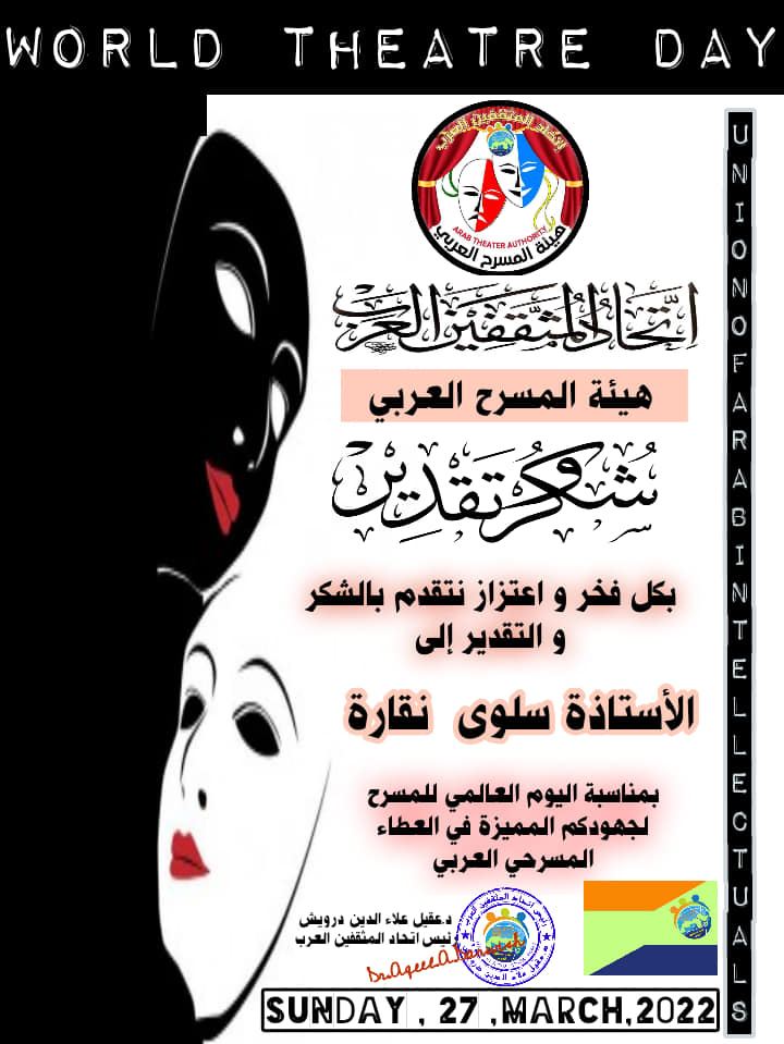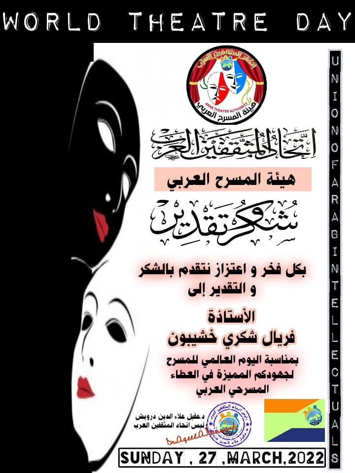 كنوز نت - بمناسبة اليوم العالمي للمسرح قام رئيس اتحاد المثقفين العرب الدكتور عقيل علاء الدين درويش بتكريم نخبة من المسرحيين الفلسطينيين الذين كان لهم دورا كبيرا في اثراء الحركة المسرحية بكافة قرى ومدن فلسطين من اقصى النقب لأقصى الجليل وهم اديب جهشان , عادل او ريا, فريال خشيبون , مكرم خوري, يوسف أبو وردة, سلوى نقارة, سامية بكرى قزموز