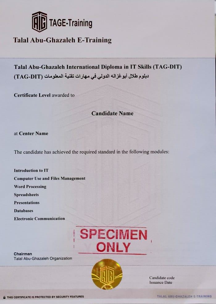 واوضح مدير مركز طلال أبوغزاله للتدريب الإلكتروني عدي القاسم أن برنامج دبلوم طلال أبوغزاله الدولي في مهارات تقنية المعلومات TAG-DIT ، كان يُقدم بالتعاون مع هيئة الامتحانات الدولية – جامعة كامبردج، وأصبح ملكاً للمجموعة وبكافة مكوناته، بعد الخبرة الكبيرة التي اكتسبها طوال ستة عشر عاما في تطوير وإدارة شهادة دبلوم طلال أبوغزاله الدولي في مهارات تقنية المعلومات، وتدريب ومنح الشهادة لأكثر من ربع مليون مواطن عربي في مختلف الدول العربية.
