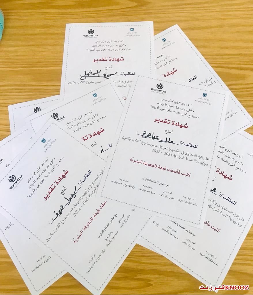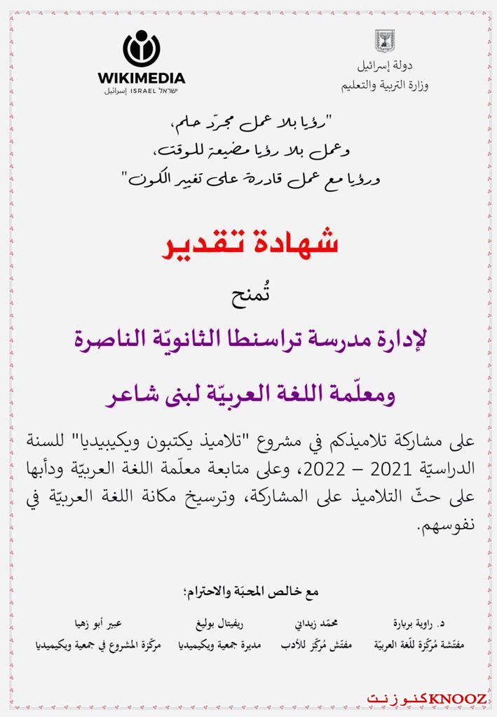 كنوز نت - وزارة التربية : توّج اليوم مشروع الكتابة في ويكيبيديا بحضور مفتّشة اللغة العربيّة الدكتورة راوية بربارة، والدكتورة ريما برانسي ومركّزة المشروع في جمعيّة ويكيميديا عبير أبو زهيّا، وبمشاركة السيّدة سامية بصول مديرة قسم المعارف في بلدية الناصرة.