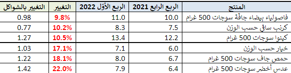 - منتجات مختارة طرأ عليها ارتفاع في السعر مقارنةً بالربع الرابع من عام 2021:
