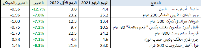 - منتجات مختارة طرأ عليها انخفاض في السعر مقارنةً بالربع الرابع من عام 2021: