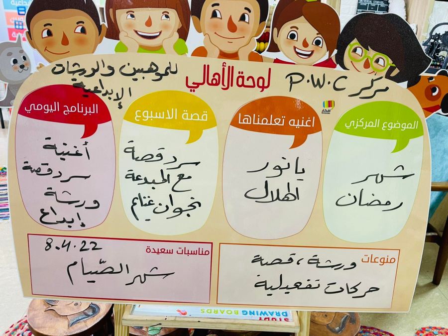 كنوز نت - كوكب ابو الهيجاء : شارك العديد من أشبال المركز P.W.C للموهوبين والورشات الإبداعية بإدارة المرشدة المهنية لتربية الموهوبين وتنمية الإبداع الكامن لتوجيه المجموعات والتنمية البشرية نجوى أبو الهيجاء بالعديد من البرامج والورشات التكوينية الإبداعية طيلة أيام شهر رمضان الكريم والتي لاقت استحسان الأهل والأبناء الذين تفاعلوا بالبرامج الإثرائية والإبداعية من رموز رمضانية ومحطات وأناشيد دينية وقصص سردية حكواتية من قبل السيدة نجوان غنايم .