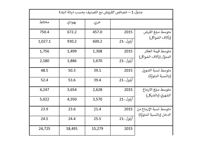 · متوسط فترة السداد للقروض في البلدات العربية طويلة مقارنةً بالبلدات اليهودية والمختلطة. ويرجع ذلك، من بين أمور أخرى، إلى الرغبة في خفض مبلغ السداد الشهري بسبب نسب الإرجاع العالية من الدخل.
