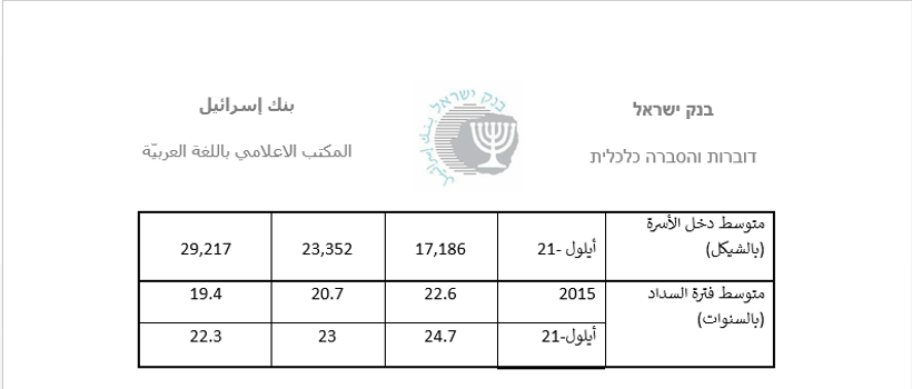 وبلغ متوسط السداد الشهري الإجمالي للمقترضين في البلدات العربية نحو 3200 شيكل، أقل بـ 800 شيكل (20٪) مقارنةً بالبلدات اليهودية. مع ذلك، فانّ معدّل نسبة الإرجاع من الدخل للمقترضين الذين يشترون عقارًا في البلدات العربية، هو أعلى بقليل مقارنةً بالمقترضين الذين يشترون عقارًا في البلدات اليهوديّة (فجوة بنحو 1.2 نقطة مئويّة بالمعدّل في السنوات 2021-2017). ويعود ذلك إلى الدخل المنخفض للأسر في البلدات العربيّة مقارنةً بالبلدات اليهوديّة والمختلطة. بحيث كان متوسط الدخل في البلدات العربية بين الأعوام 2021-2015 أقل ب- 21٪ بالمعدّل مقارنة بالبلدات اليهوديّة. كما يتضح أنّ فترة السداد المتوسطة للقروض في البلدات العربيّة هي أطول مقارنةً بالبلدات اليهودية (1.7 سنوات) والبلدات المختلطة (2.4 سنوات)، ويعود ذلك على ما يبدو إلى رغبة المقترضين إلى خفض مبلغ الإرجاع الشهري ونسبة الإرجاع من الدخل. لكن رغم خفض مبلغ الإرجاع الشهري، الا أنّ ذلك يمسّ بدخل الفرد للمدى البعيد ويحتل جزءًا كبيرًا من دخله.