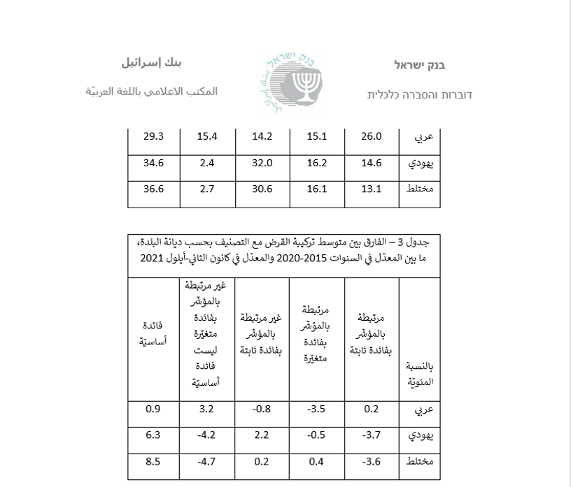 كما أنّ الاعفاء من تقييد الفائدة الأساسيّة كان له تأثيرًا أقل على تركيبة القرض للمقترضين الذين اشتروا عقارات في البلدات العربية مقارنةً بتأثير هذه الخطوة على القروض المخصّصة لشراء عقارات في البلدات اليهوديّة والمختلطة. ووفق معطيات شهر أيلول 2021، ارتفع حجم مسار الفائدة الأساسيّة بحوالي 8.5 نقطة مئوية في البلدات اليهودية، مقارنةً بزيادة قدرها 6.3 نقطة مئوية في البلدات العربية (جدول 3).