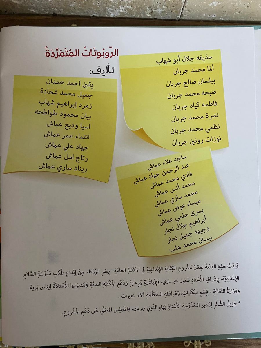 كنوز نت - صدر حديثا : الروبوتات المتمردة ، قصة جديدة للأطفال ، عن أ. دار الهدى بإدارة عبد زحالقة ، تقع القصة في 28 صفحة من الحجم الكبير ، غلاف سميك ، تأليف مجموعة من الطلاب المبدعين من مدرسة السلام الإعدادية في جسر الزرقاء ، ضمن مشروع الكتابة الابداعية ، بدعم من المكتبة العامة ومديرتها الأستاذة ايناس برية ، وبإشراف الأستاذ سهيل عيساوي ، رسومات الفنانة الاء مرتيني ، مراجعة لغوية الأديب صالح كناعنة ، تتناول القصة موضوع الخيال العالمي ،واحداث واختراعات تقع عام 2030، تسبب الأرق والمتاعب للبشرية . كتبت القصة بأسلوب جذاب ولغة سلسة .