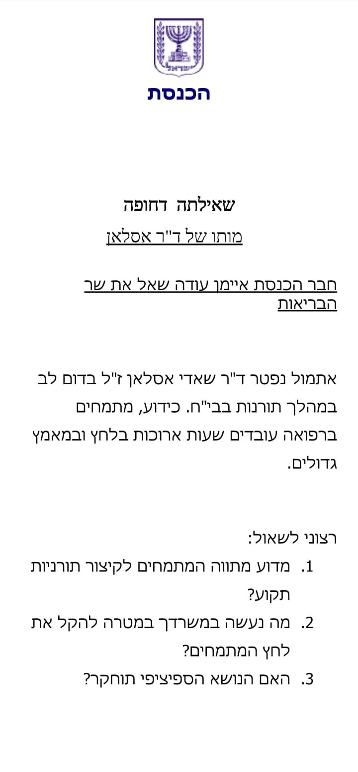 كنوز نت - أرسل رئيس القائمة المشتركة النائب أيمن عودة استجوابًا مستعجلًا لوزير الصحة نيتسان هوروفيتس حول ظروف موت الطبيب شادي أصلان ابن قرية المزرعة والذي لقي حتفه اثر نوبة قلبية ألمت به أثناء مناوبته في مستشفى بن تسيون في حيفا.