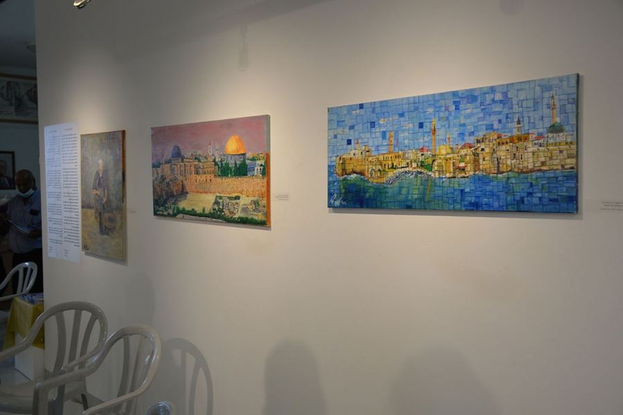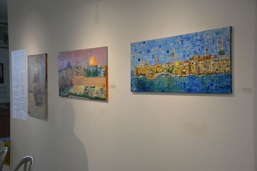 رؤية شاعرية تعكس ثقافته الأدبية والعلمية بألوان زاهية مونوخرومية يُصوّر أماكن ومدن لها أثر تاريخي أو روحاني في وجدانية الفنان , مثل مشهد لمدينة القدس .