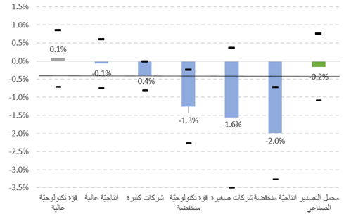 • إلى جانب ذلك، يؤثر سعر الصرف بشكل كبير على الشركات الصغيرة التي تتميز بإنتاجية منخفضة. بالنسبة لهذه الشركات، من المتوقع أن يؤدّي ارتفاع سعر الصرف الحقيقي بنسبة 1 في المائة إلى انخفاض في الصادرات بنسبة 1.6 إلى 2 في المائة بالمعدّل.