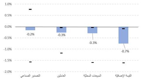 رسم بياني 1: التأثير الكلّي لارتفاع قيمة العملة الحقيقي بنسبة واحد في المئة على متغيّرات مختلفة في فروع الصناعة