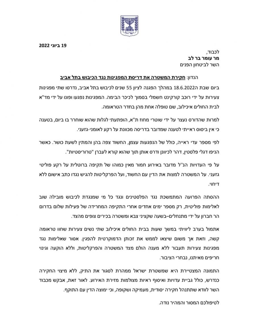 تأتي هذه الرسالة على خلفيّة عمليّة دهس المتظاهرات روز ومنى أسدي اللتان تظاهرتا ضد الاحتلال في تل أبيب يوم الخميس المنصرم وبعد ان اتضح ان الشرطة قامت بإطلاق سراح المشتبه به بعد بضع ساعات فقط من التحقيق بحجة أن ليس هنالك أساس للادعاء بأن الدهس متعمد وعلى خلفيّة قوميّة عنصريّة.