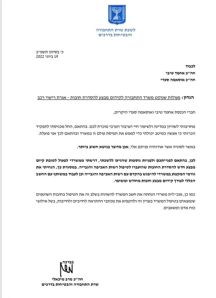 كنوز نت - العربية للتغيير : ردت وزيرة المواصلات ميراف ميخائلي على توجه النائبين د. احمد الطيبي واسامة السعدي- *المشتركة* بخصوص النهوض بحملة لتسديد الديون ورسوم ترخيص المركبات وجاء في رد الوزيرة بان من واجبها العمل على المساواة وتحسين ظروف المواطنين في البلاد