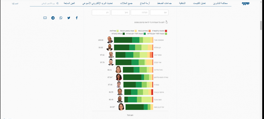 قالت جمعية شاكوف لمتابعة عمل الكنيست : في السنوات الأخيرة ، قمنا بقياس أعضاء الكنيست "الشفافين" وفقًا لاستخدام كل أداة برلمانية متاحة لهم. أنشأنا للمرة الأولى فهرسًا يوحد كل هذه الأدوات معًا ، حتى نتمكن من إعطاء مجموع نقاط لكل عضو الكنيست.