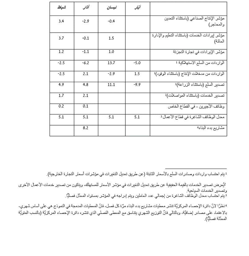 تأثر المؤشر المركب بشكل إيجابي بارتفاع مؤشر إيرادات الخدمات (نيسان)، ومؤشر إيرادات تجارة التجزئة (نيسان) ، وواردات مدخلات الإنتاج (أيّار)، وصادرات الخدمات (آذار)، ووظائف الأجيرين (آذار). ومشاريع بدء البناء (آذار).